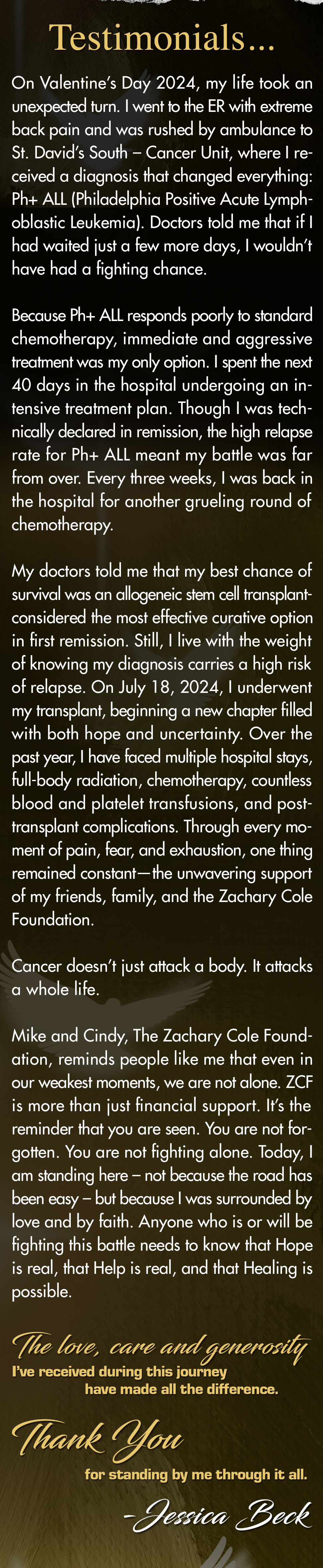 The Zachary Cole Foundation is a 501c3 nonprofit foundation. We are guided by a charter and parameters set by a respected board of directors detailing the assistance we provide. We would love to help each and every cancer patient, but unfortunately that just isn't possible. We are so very grateful for the resources we receive from corporations, individual and volunteer support. We are also grateful to be able to assist those we are able to assist. We realize not everyone agrees with our mission, we respect that.